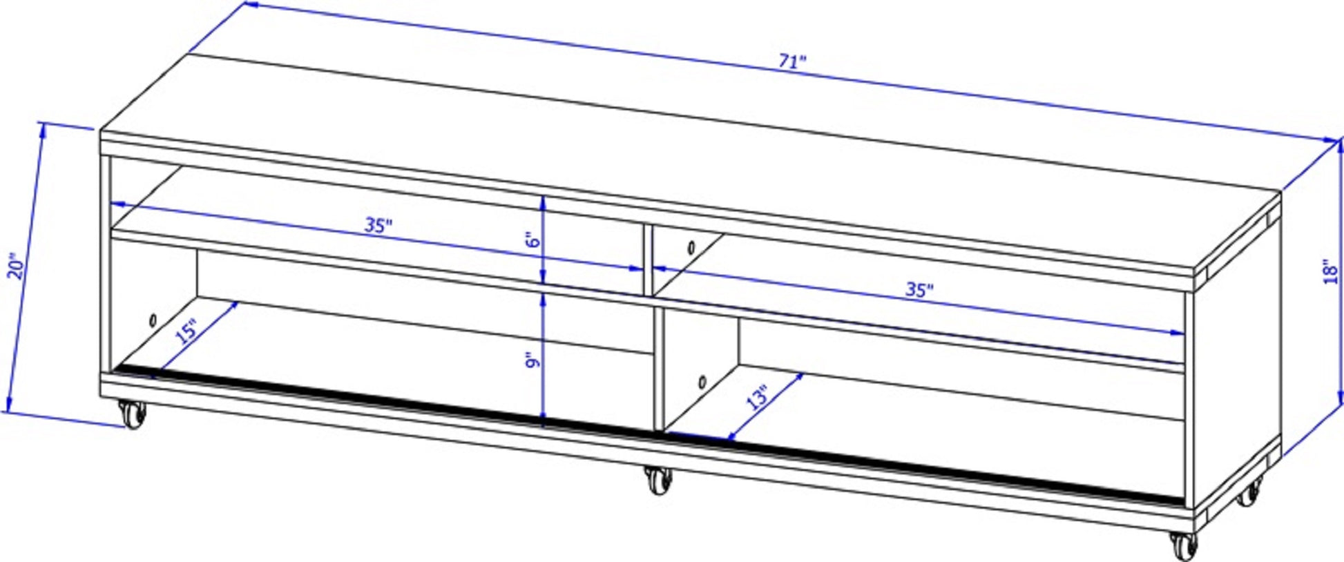 - Upon assembly, TV Stand Dimensions Measure: 70.47 in. Length, 24.01 in. Height, 14.02 in. Depth